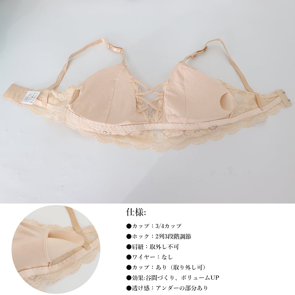 ●仕様:3/4カップ、ホック2列3段階調節、肩紐取外し不可、ワイヤーなし