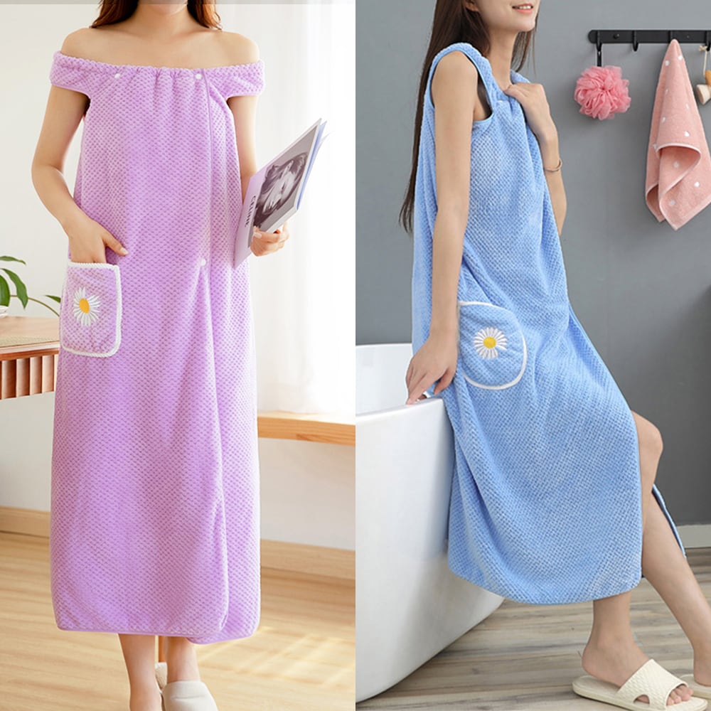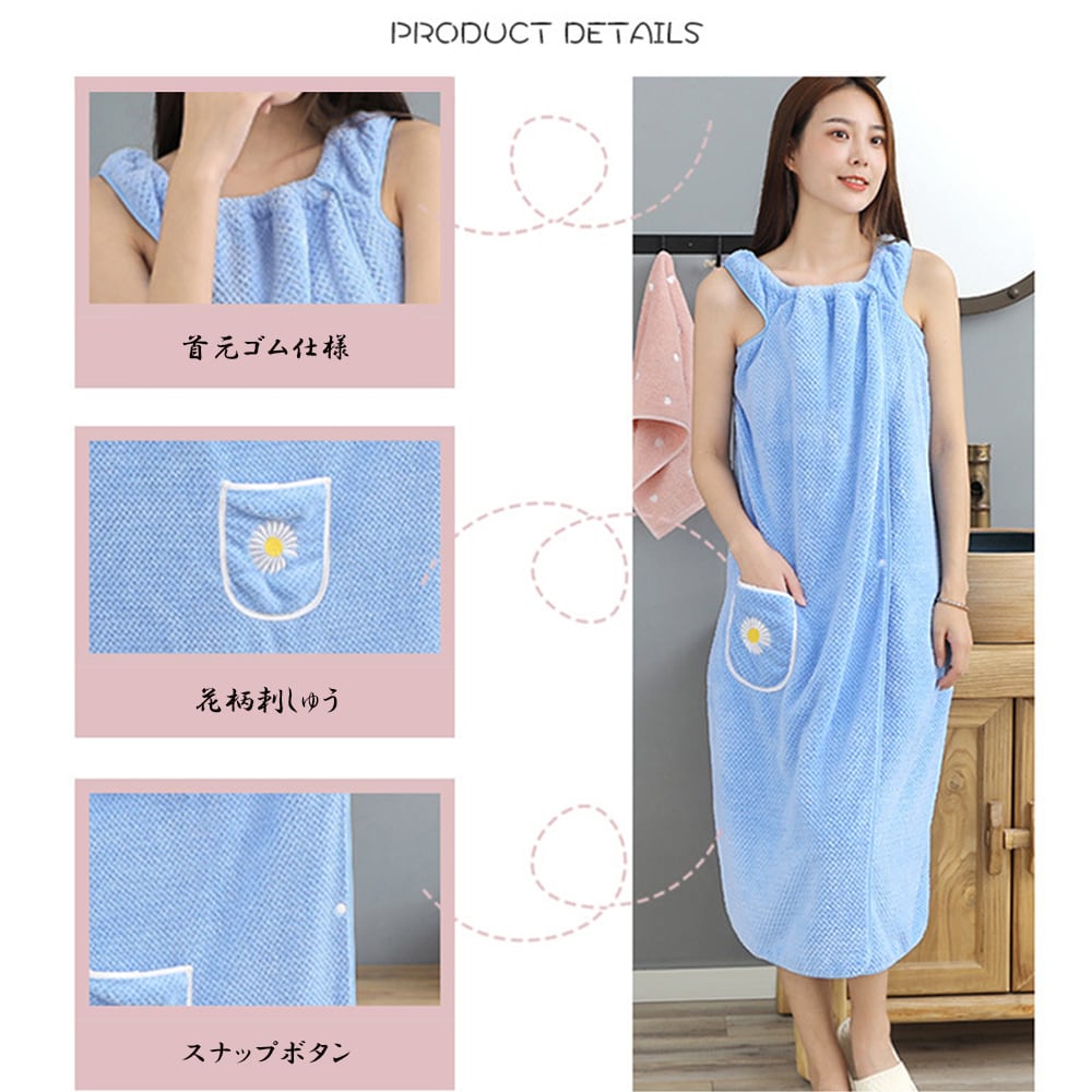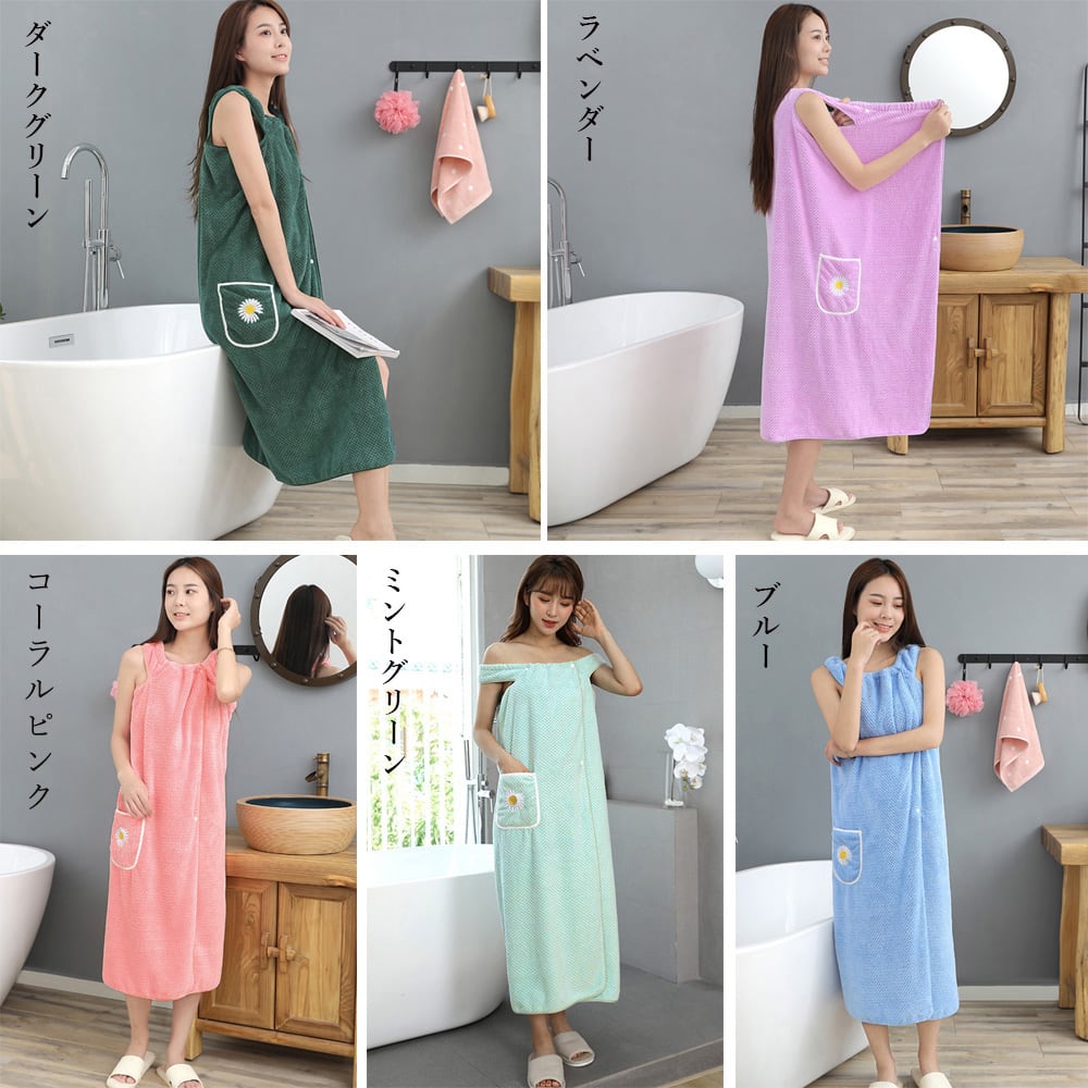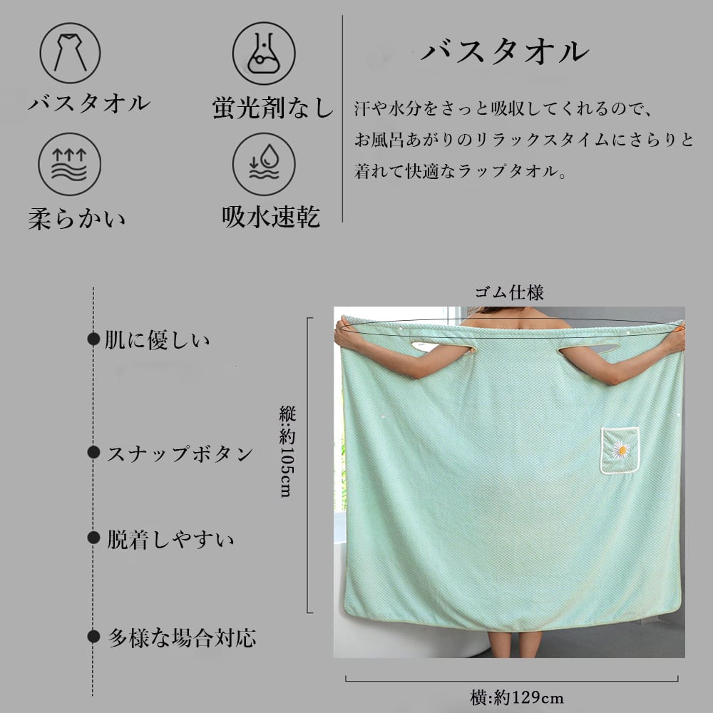 汗や水分をさっと吸収してくれるので、お風呂あがりのリラックスタイムにさらりと着れて快適なラップタオル