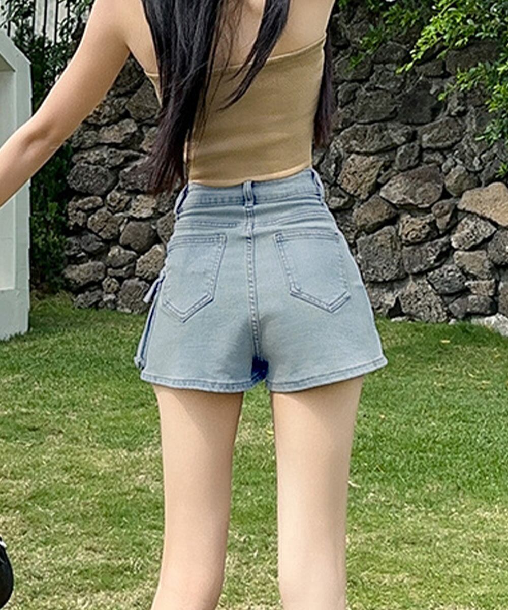 アシンメトリーカットの被せが個性的で、ユニークな印象を与えるレディースデニムショートパンツ