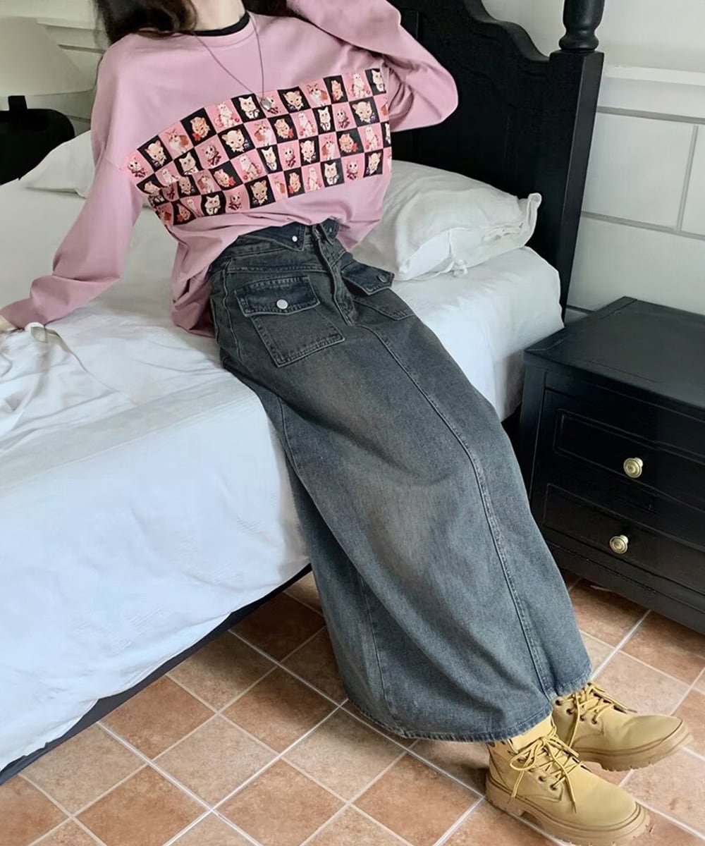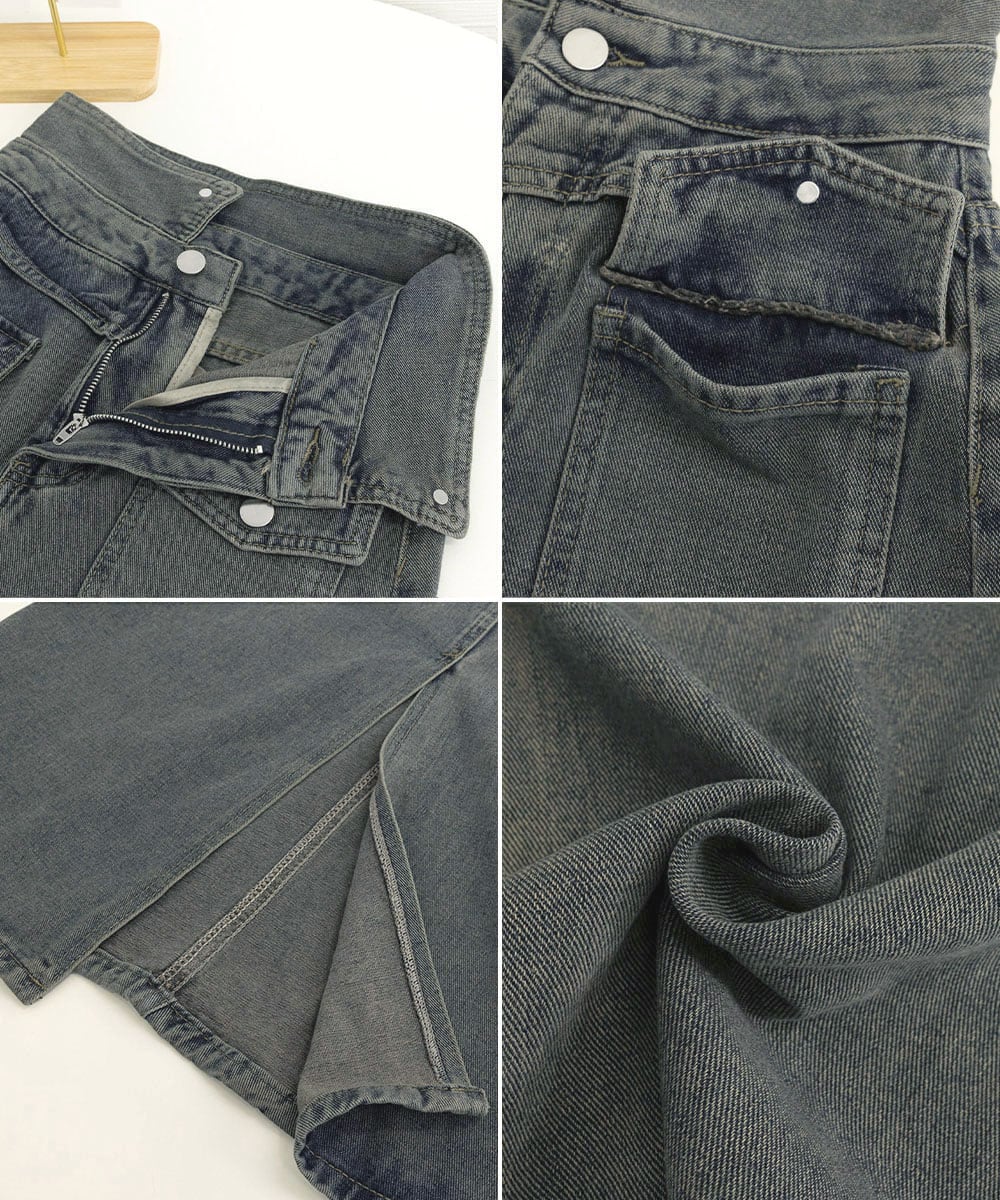 レディースロングスカート ウエスト折り返し Aライン レトロデニムスカート 美脚脚長春夏秋冬 ヴィンテージウォッシュ加工