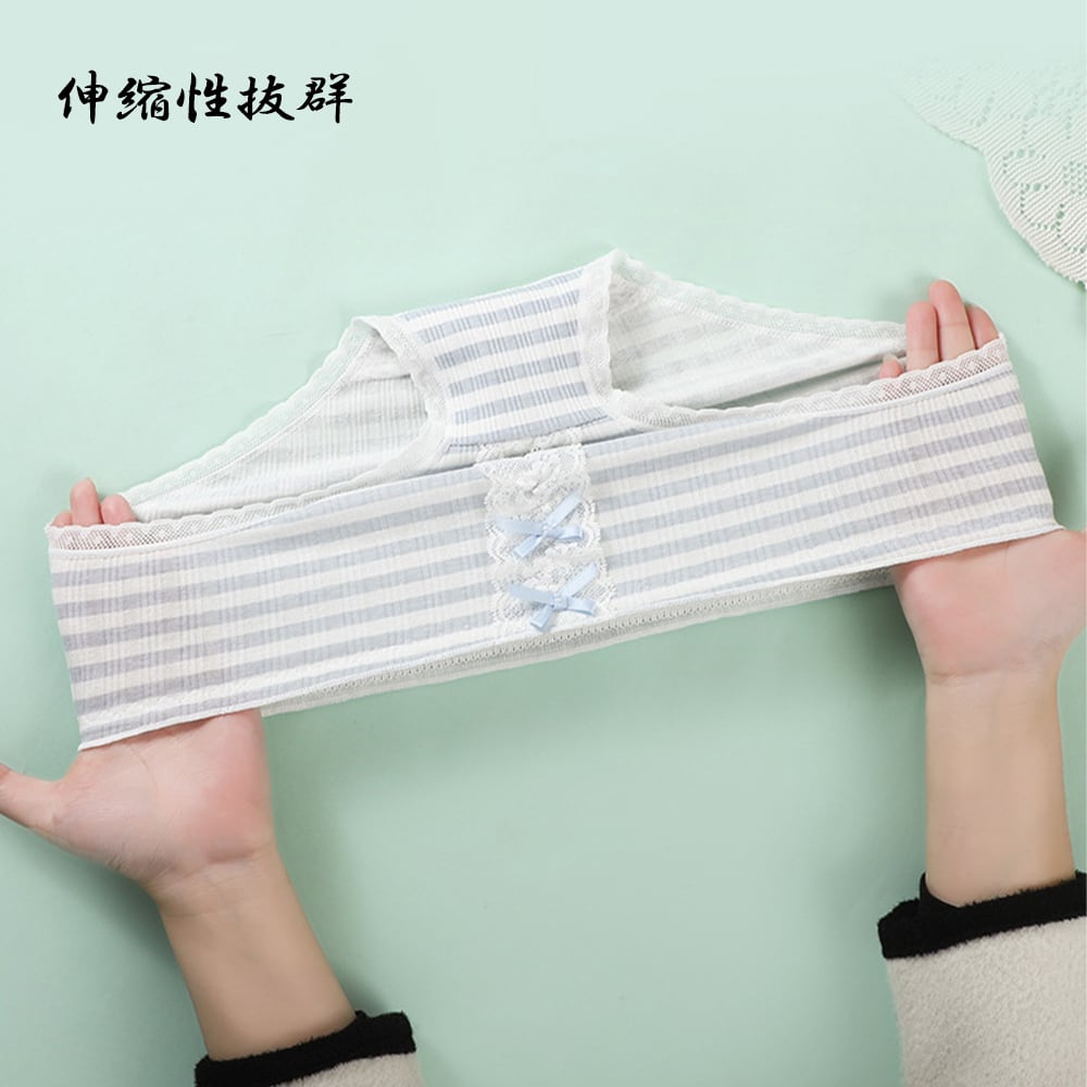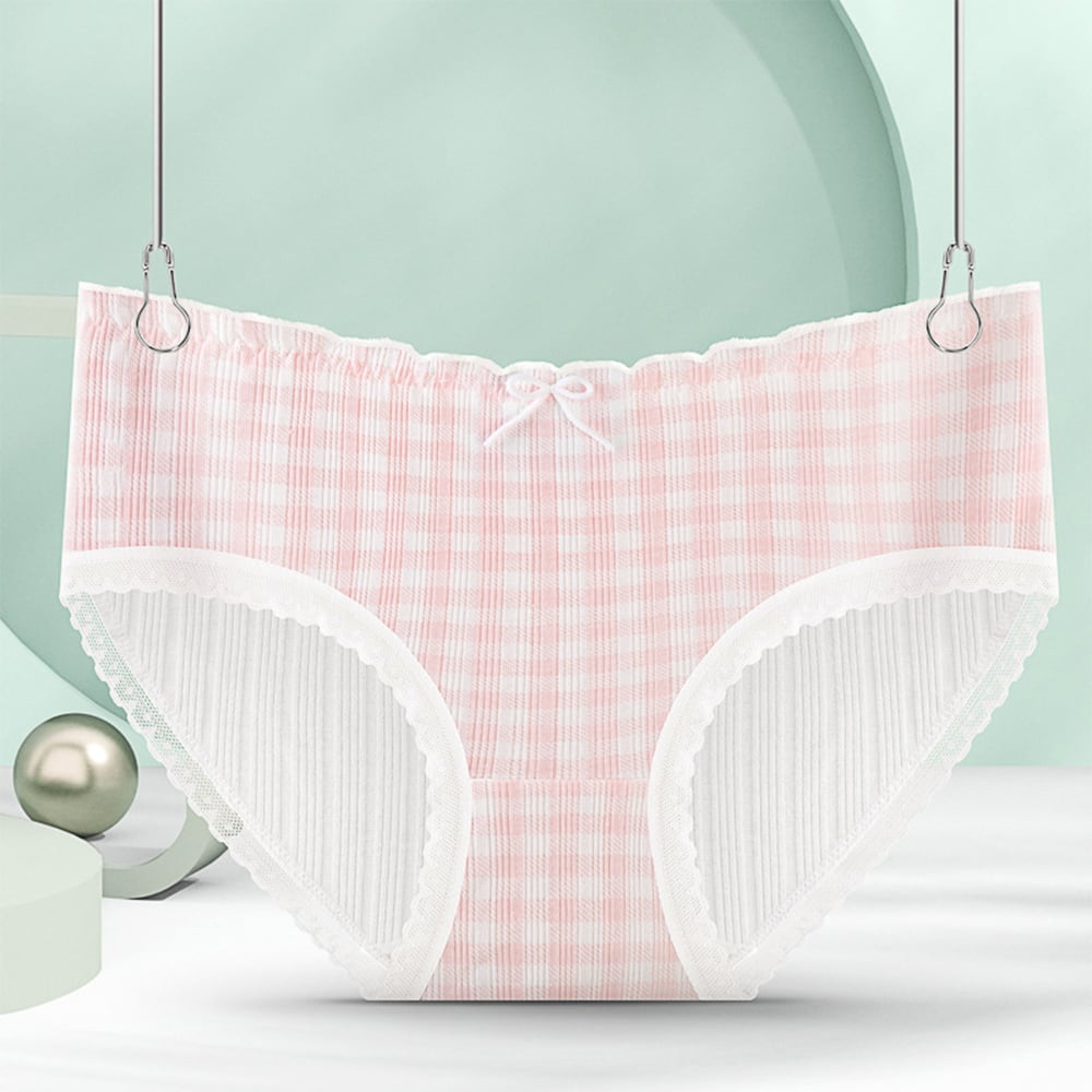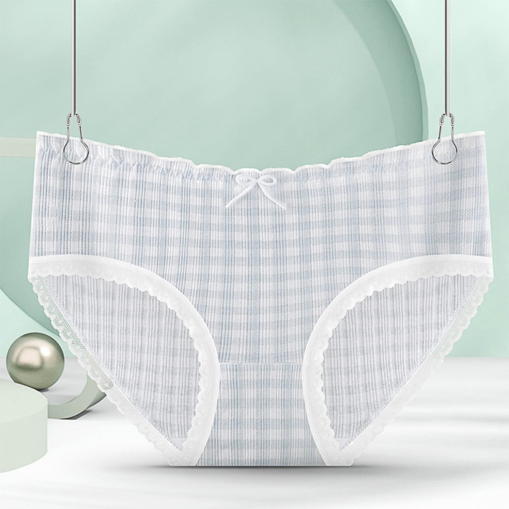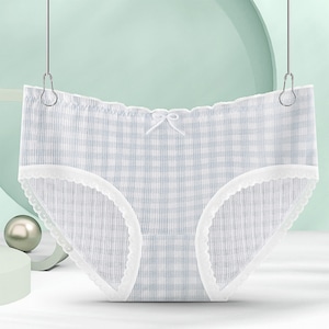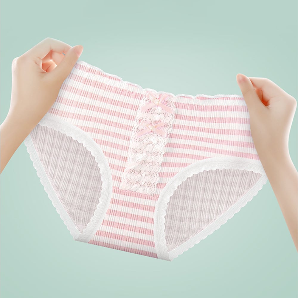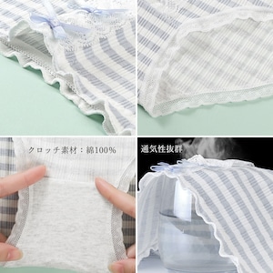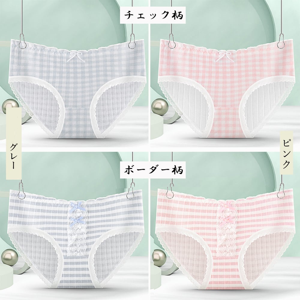定番のチェック柄とボーダー柄にフェミニンテイストな色合い、レースとリボンを施しオトナガーリー感満載の綿混ショーツ
