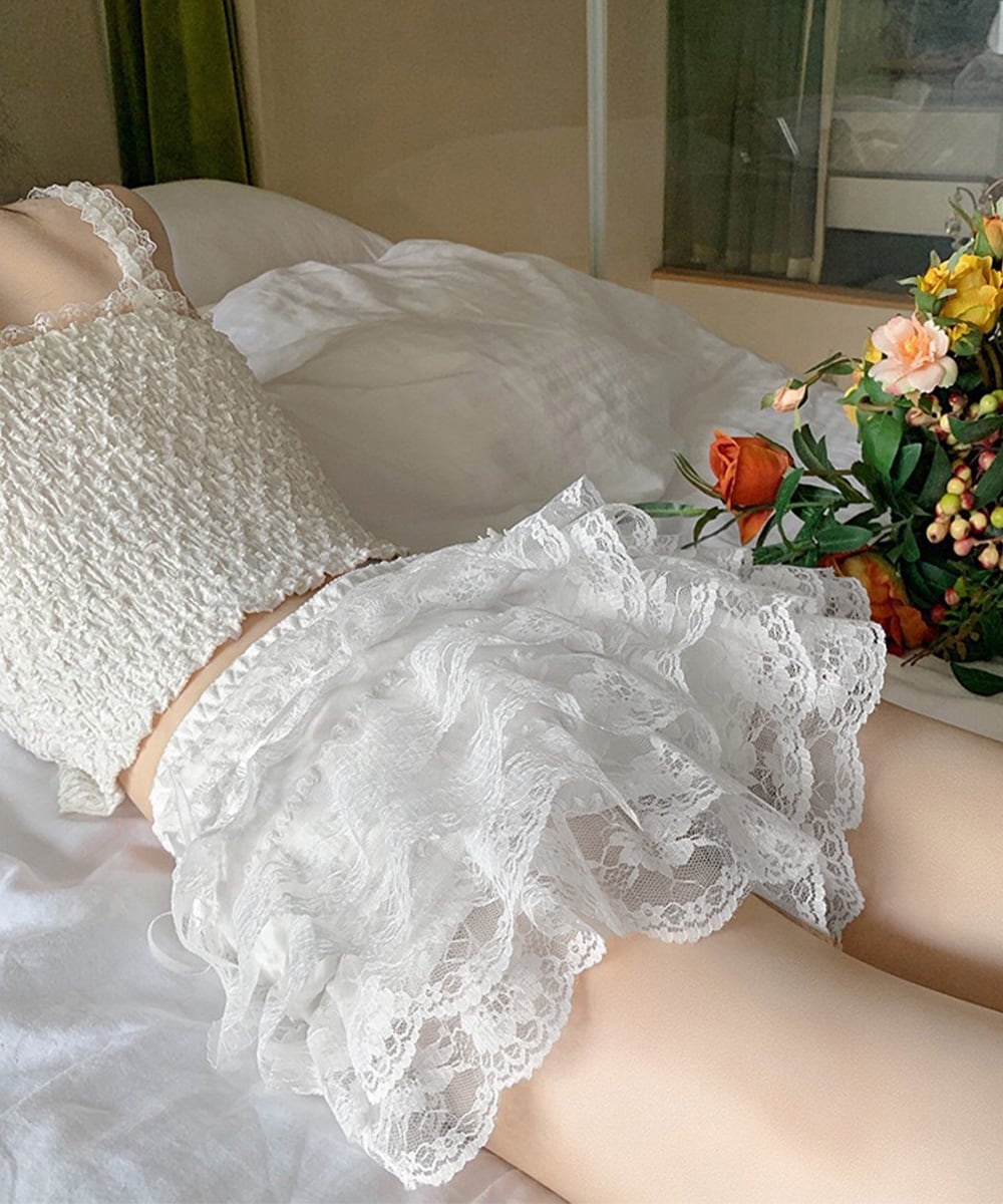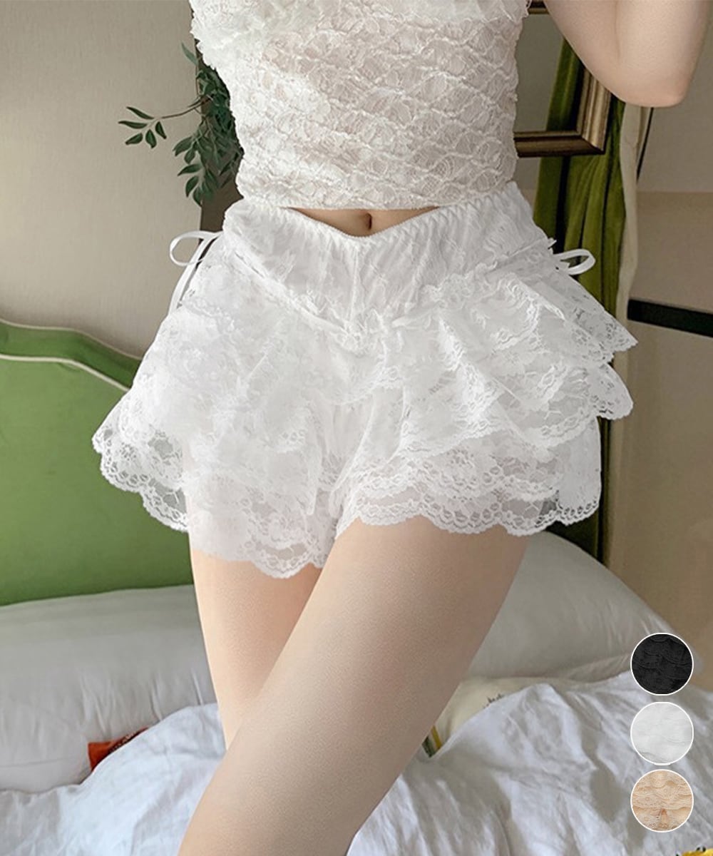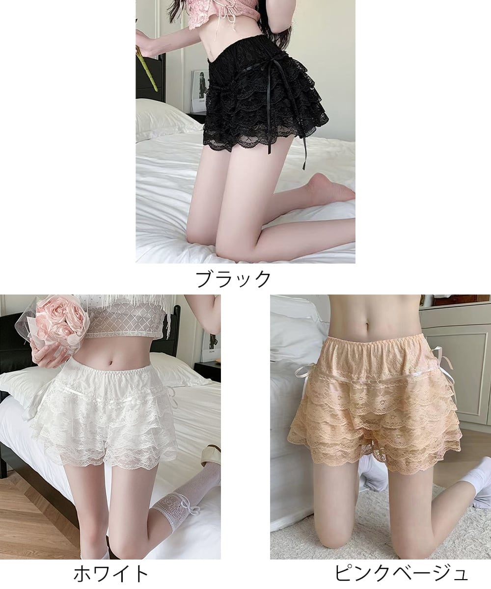 透け防止フリルインナーパンツ チラ見せ防止タップパンツ ウエストゴムショートパンツ 総レース 楽ちん部屋着 涼しい寝間着