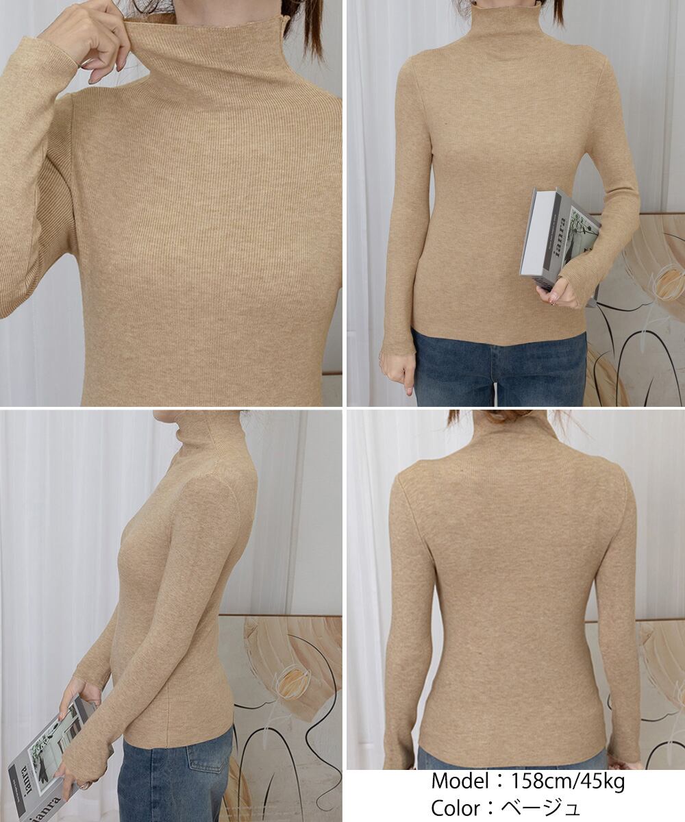 柔らかく滑らかな肌触りが魅力のリブ編みタートルネックニットトップス。