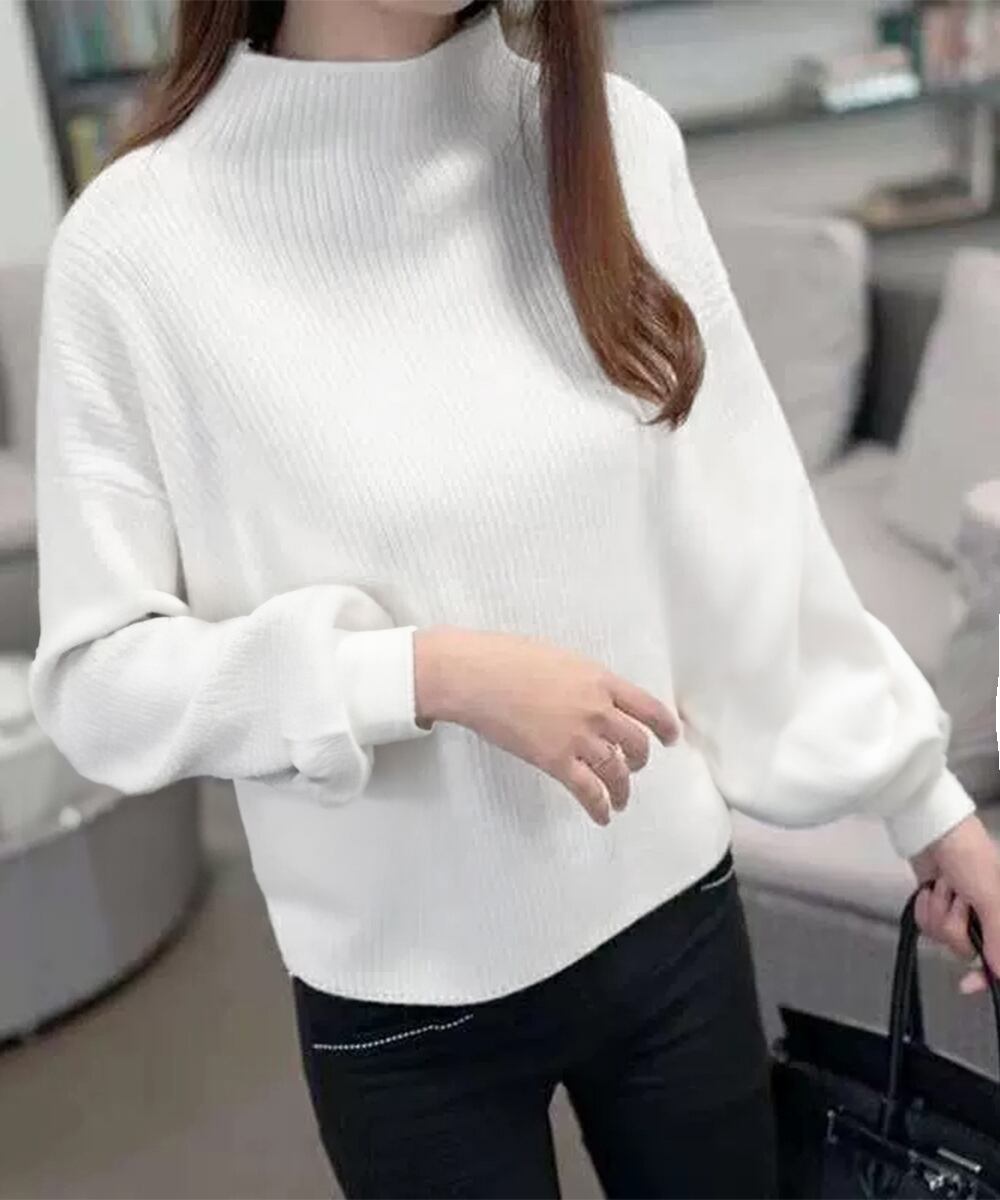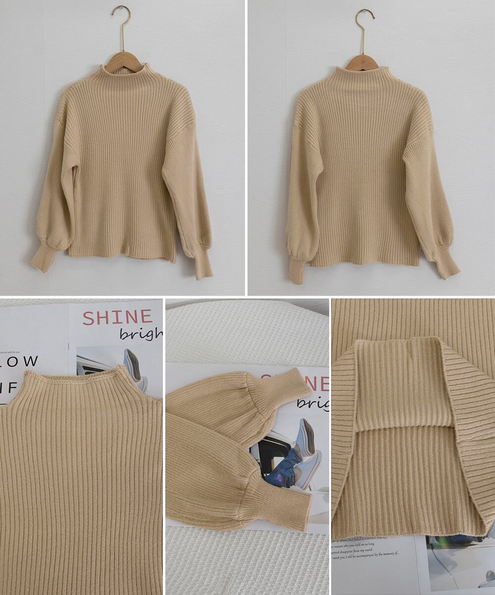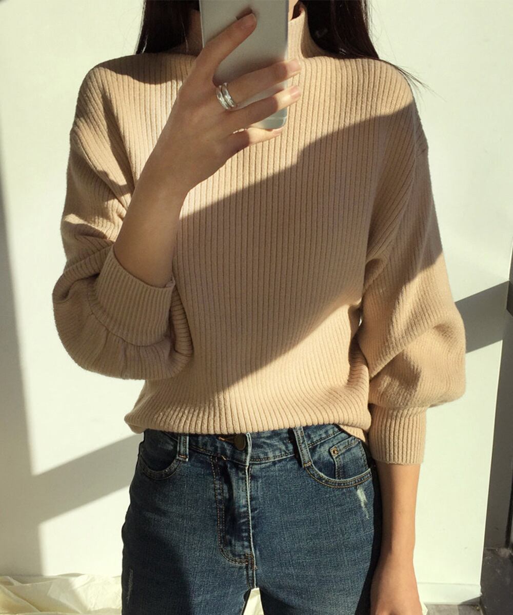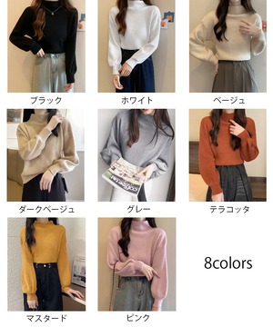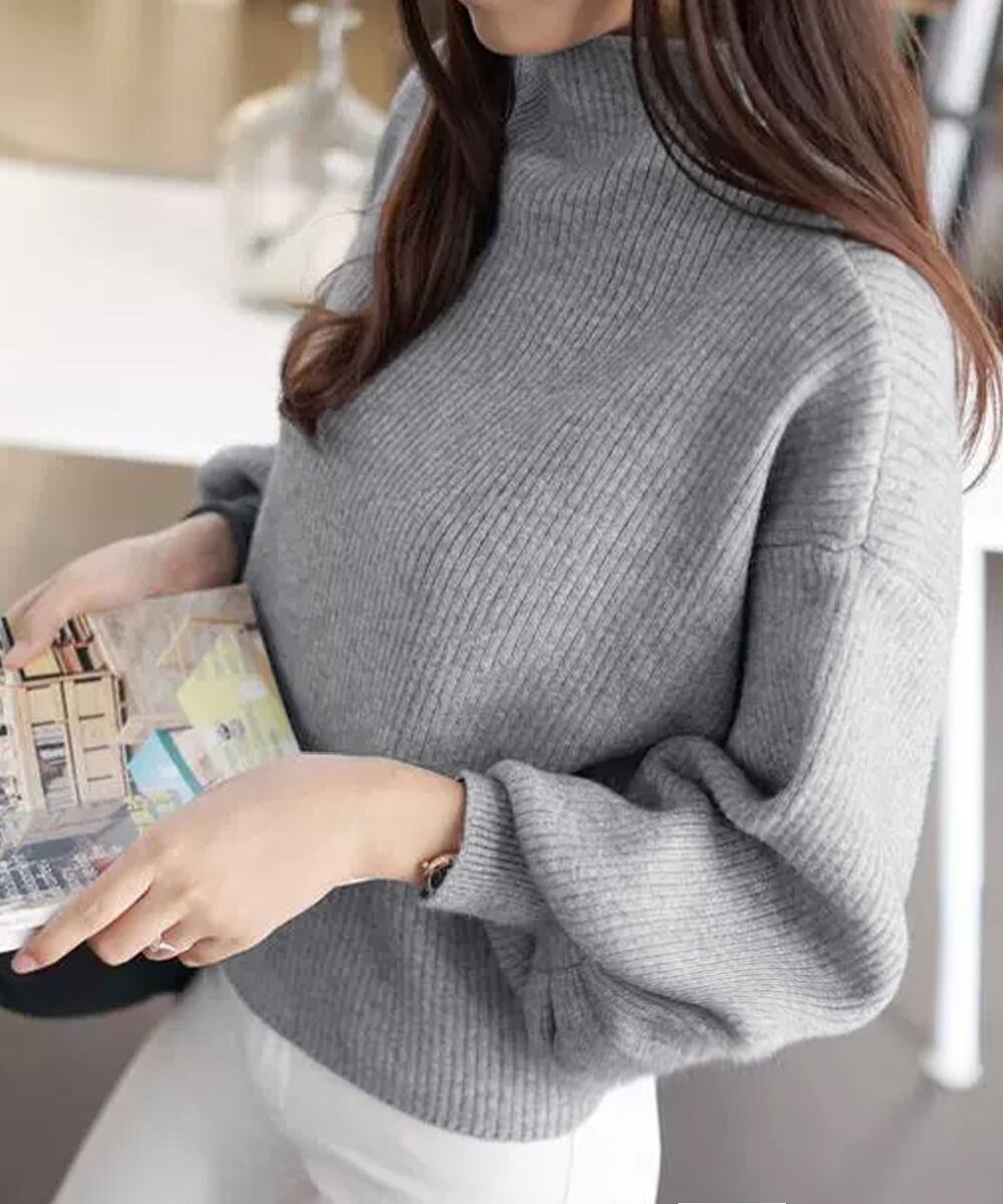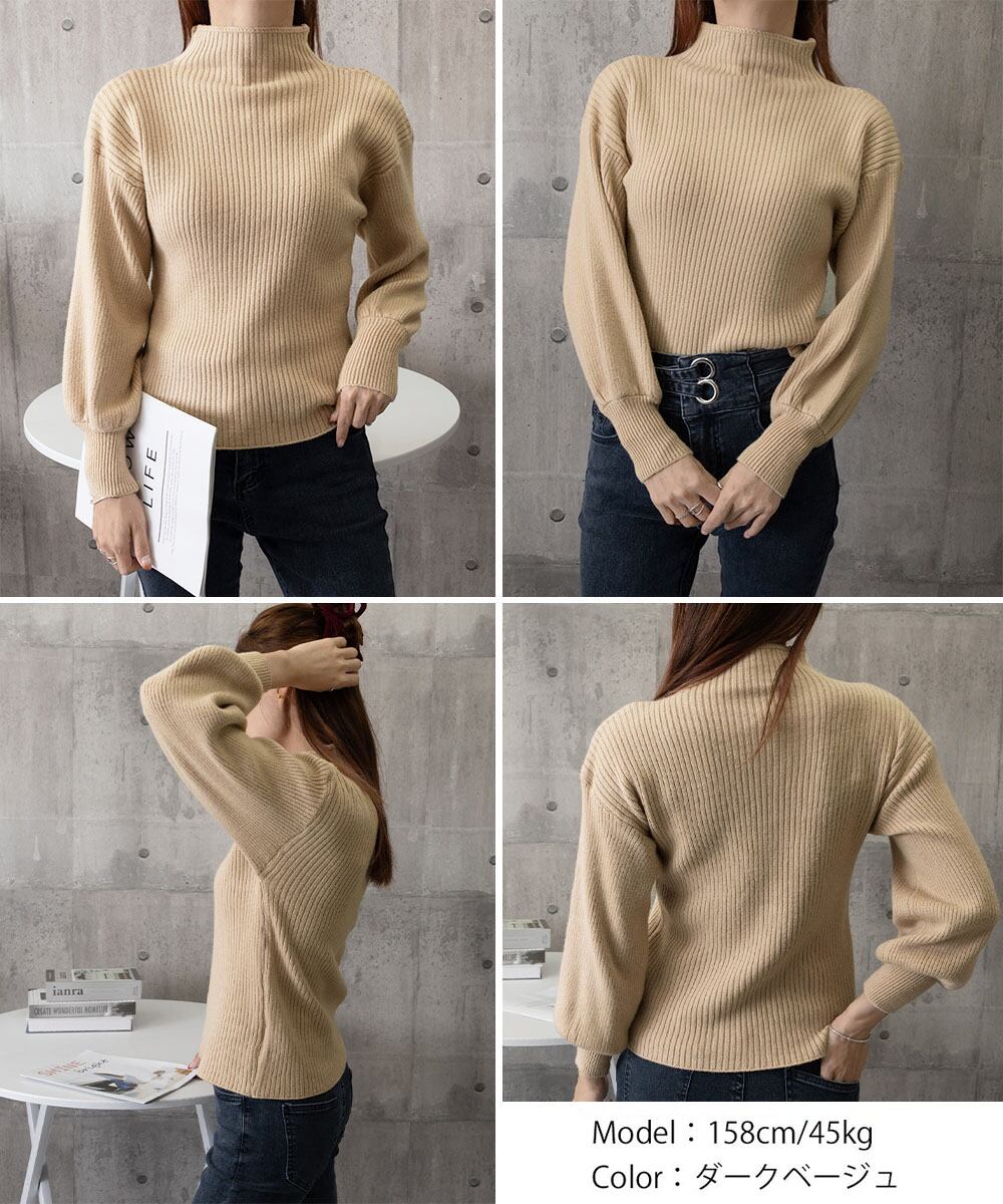 ボリューム袖が女性らしいハイネックリブニットセーター。
