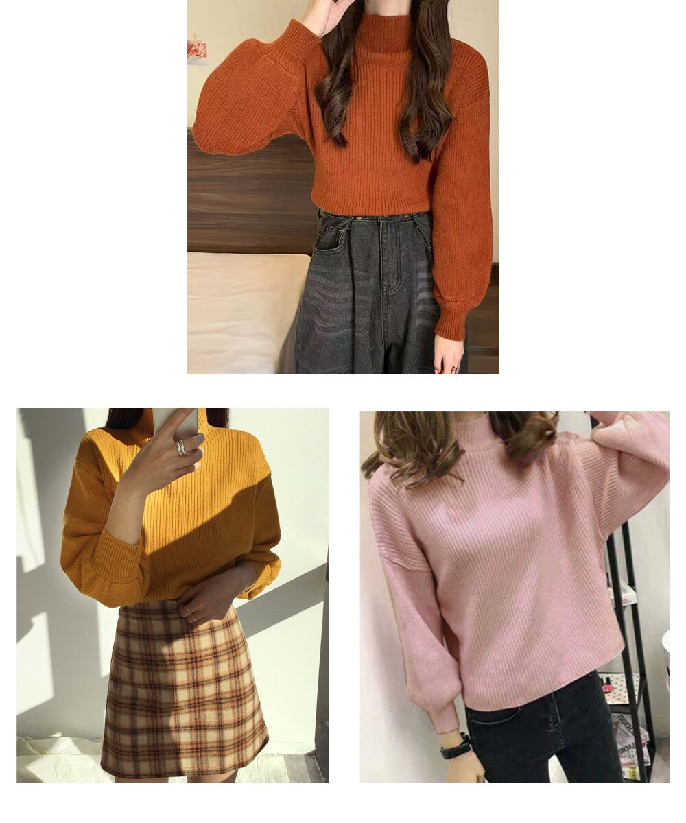 長袖ニットセーターランタンスリーブ 柔らかいニットソー暖かい チクチクしないニットプルオーバー 無地インナートップス秋冬