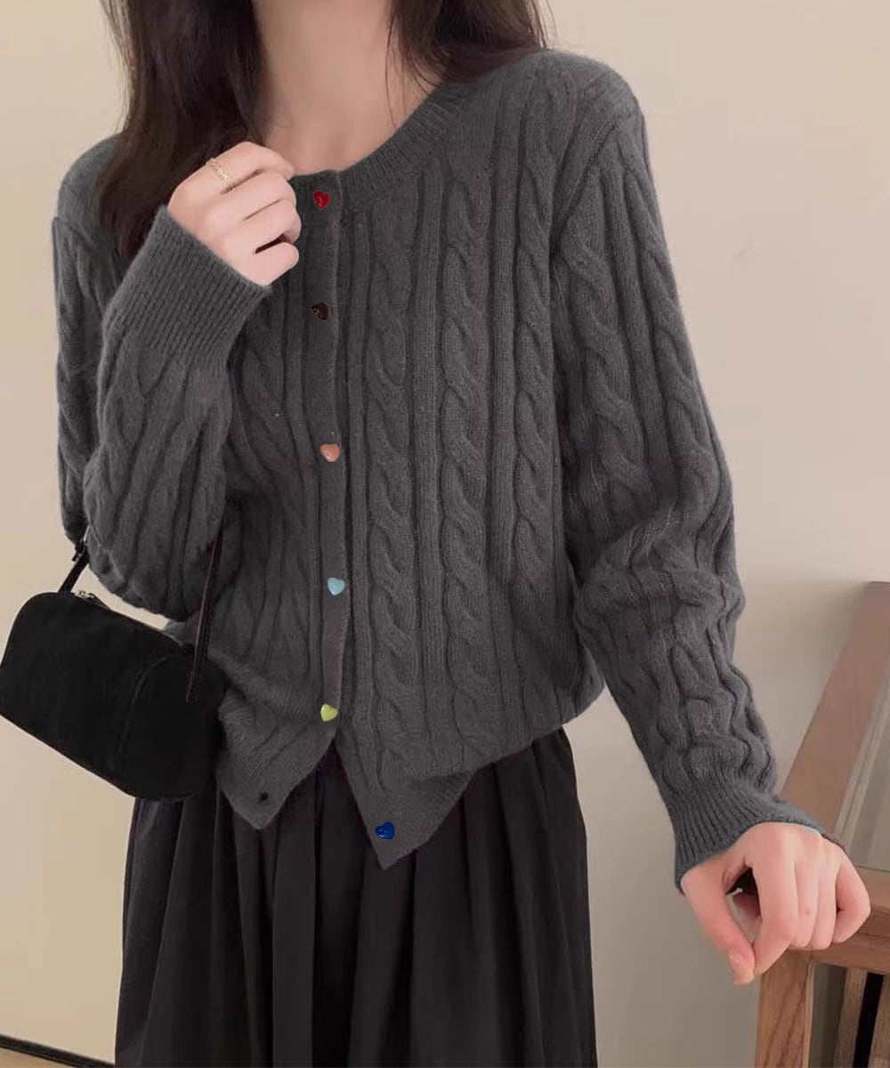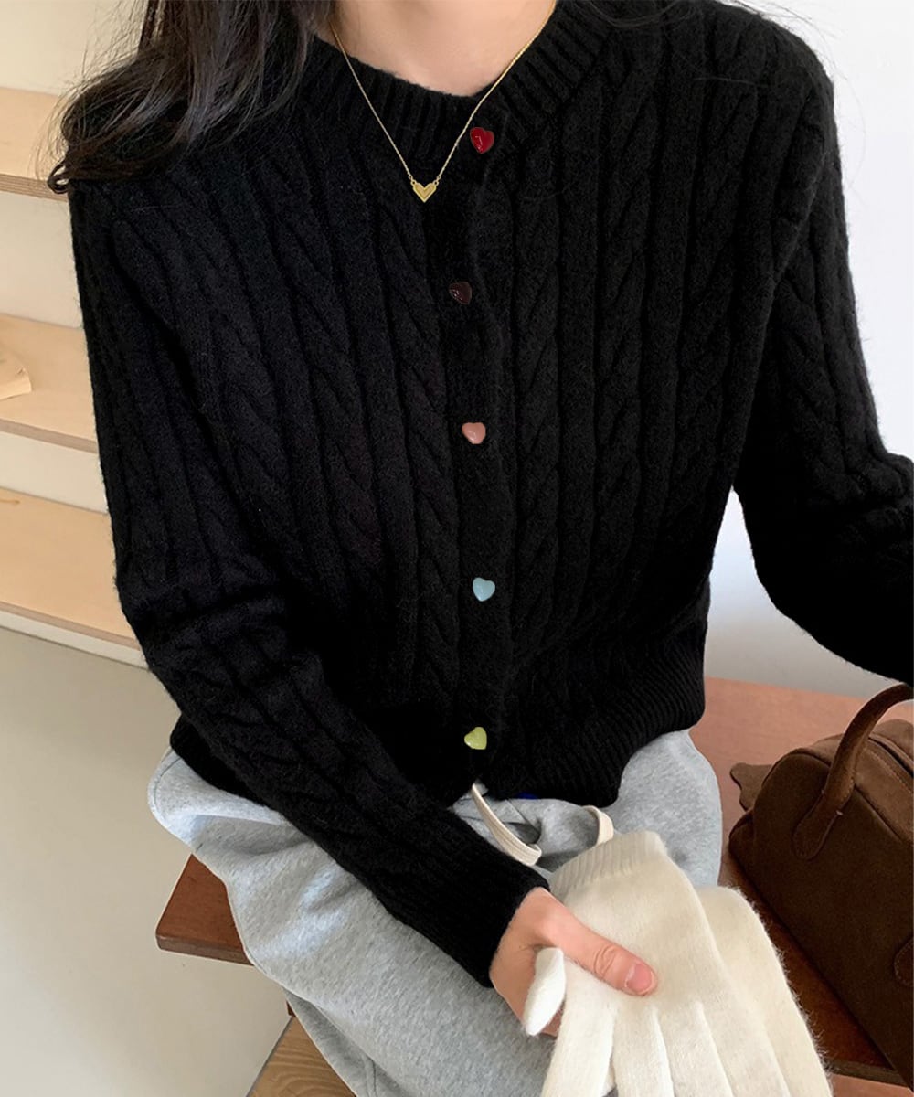 レディース カラーハートボタンニットトップス クルーネックニットセーターきれいめカジュアル ニットアウター お洒落秋冬服